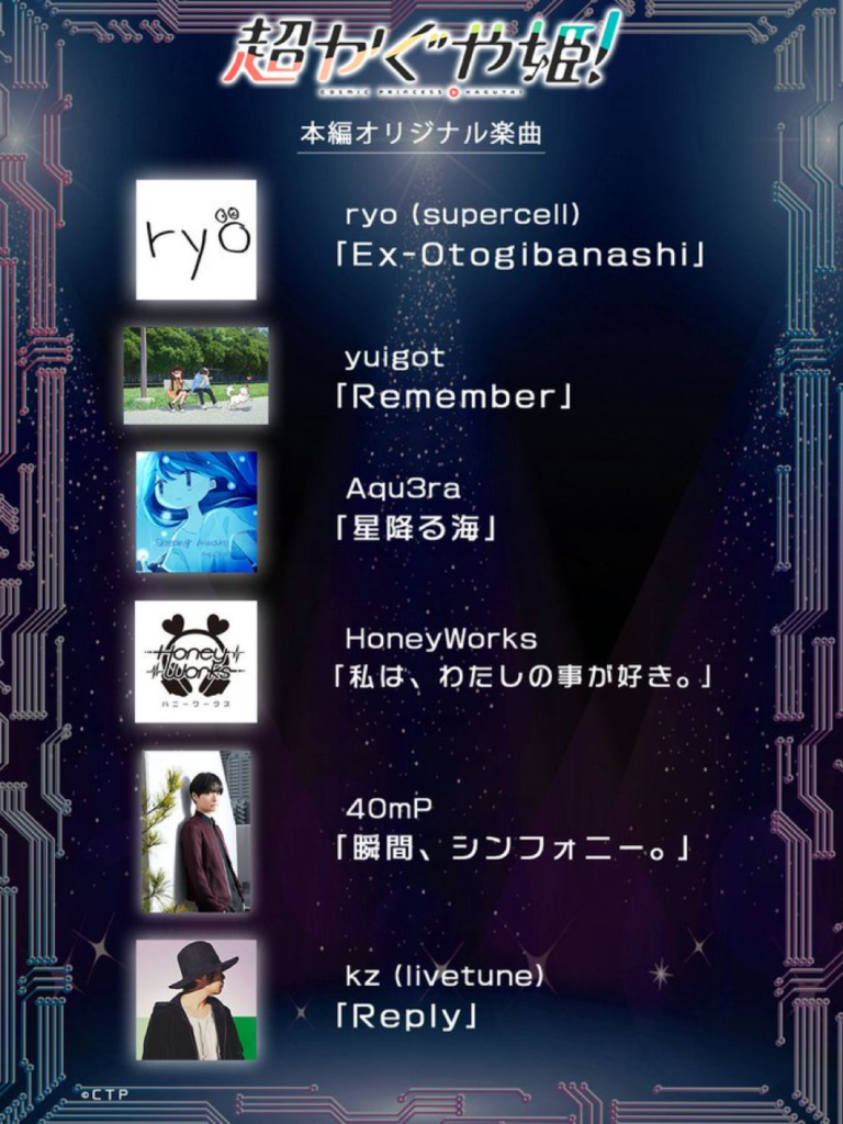 主題歌を含む劇中歌には、「ray(超かぐや姫!Version)」をはじめとした本編オリジナル曲に加え、往年のボーカロイド楽曲を大胆に再構築したカバーやリミックス曲も多数使用されている。